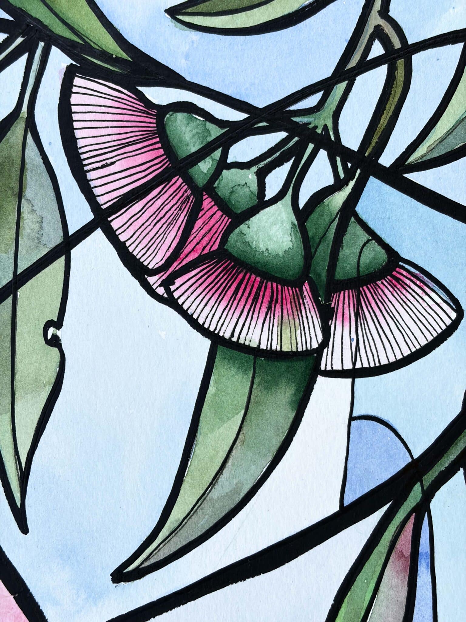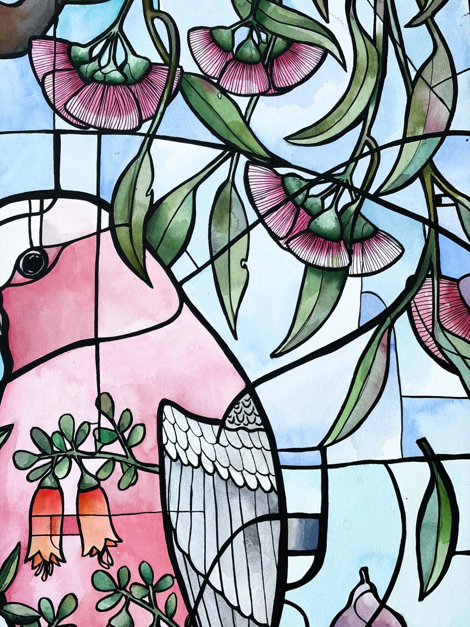 There is a balance of bold and intricate linework on top of textured and light filled watercolour washes. Watercolour washes fill the spaces created by the ink line work and makes the piece look like stained glass.
