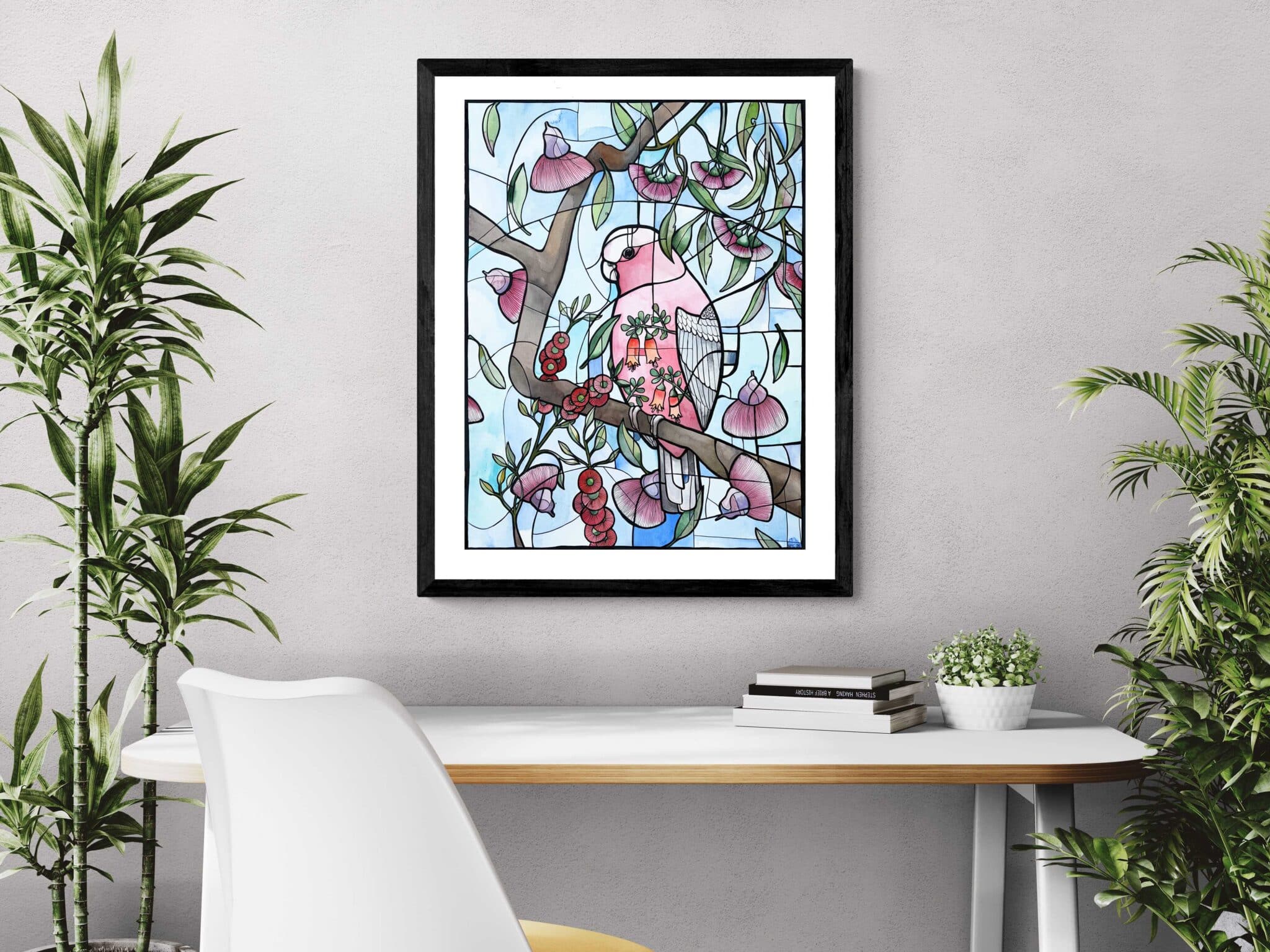 A pink and grey galah with correa flowers adorning its belly sits amongst gum blossums and bottlesbrush flowers.