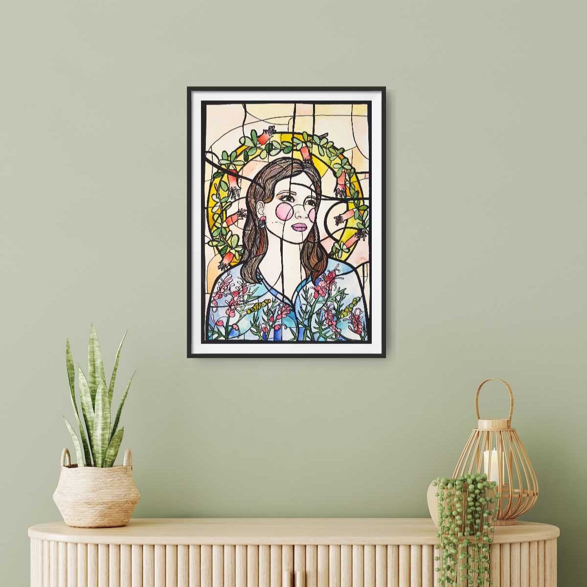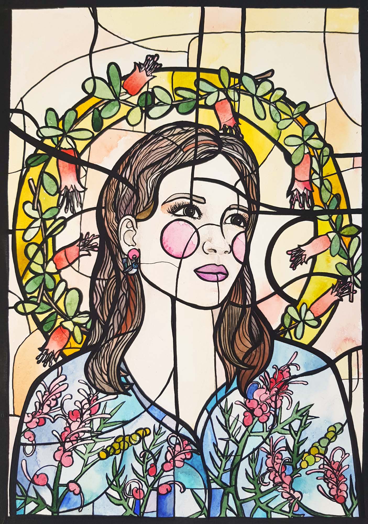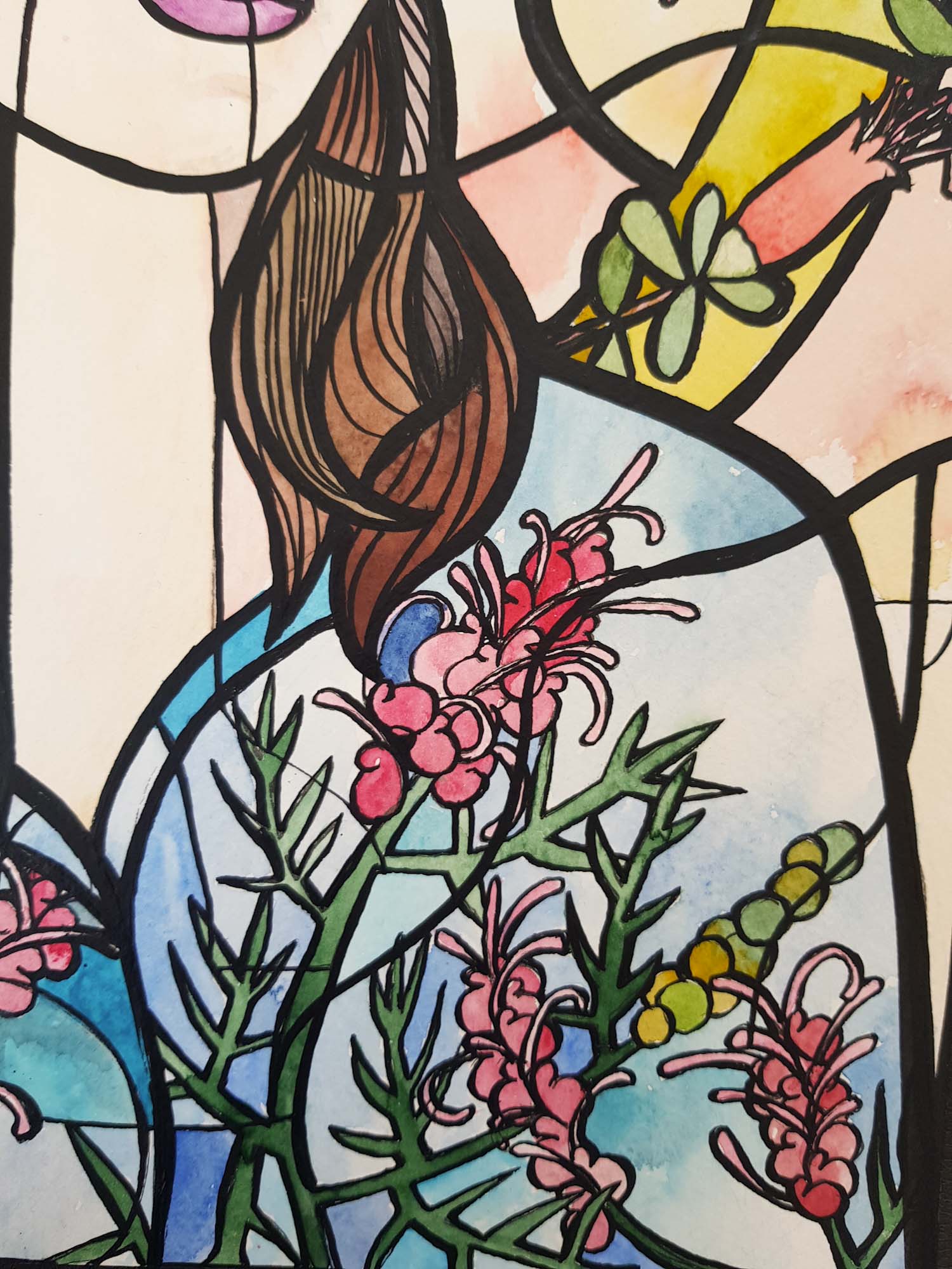 A ring of correa flowers encircle the head of the female figure whose clothing is filled with a pattern of Grevillea flowers.